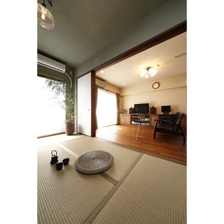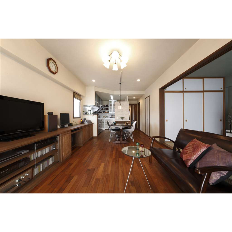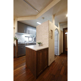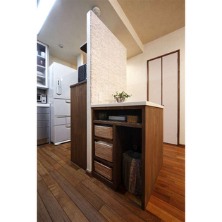 キッチン作業をこもり型から、開かれる空間への変更と、和室の風情は残し、リビングダイニングで取り入れたい空間イメージは尊重。違和感のない室内にしたくリフォーム。生活動線と収納量も維持しながらオープンにつなげるため、キッチン廻りに適度な壁を造作。天井まで届かない壁は、「収納」、時には「スペース」の間仕切りとして空間を分断しない、2WAY動線を確保。適度に隠しながらも開かれる間取りのキッチンとした。質感として、無機質なタイルでデザインした温かみをプラスした石のデザイン。リビングでの寛ぎにつなげる、無垢デザインの造作家具。こだわりの「和の残し方」には和室の内装色に新たな風格を投影。