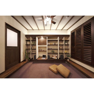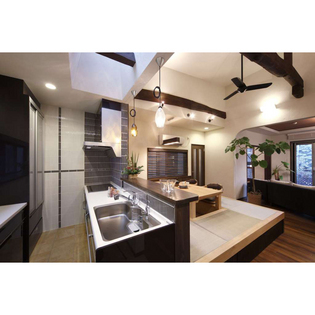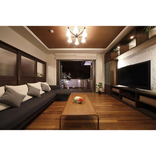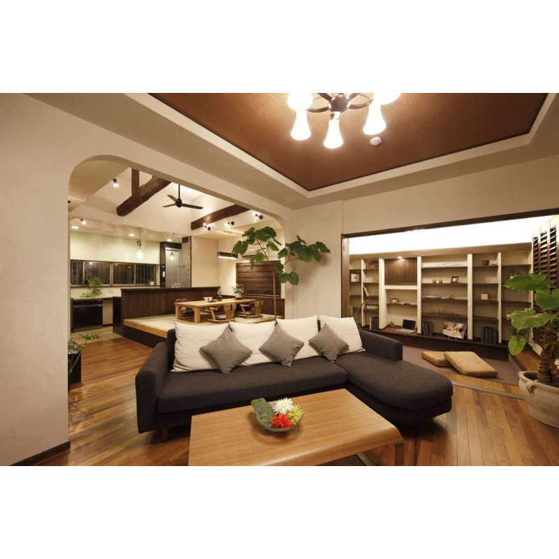 開放的な空間を確保する為、間仕切り撤去箇所を木建門型フレームで構造補強し大開口を実現。リビングの窓はフルオープンにし、外にバーベキューを楽しめる大きなウッドデッキを設置。メインのリビングは大きなTVを家族で楽しめる。ダイニングスペースは掘り炬燵・収納付小上りを設置。食事をした後は横になれ、中庭の緑を楽しめる癒しの空間へ。見上げると高い天井。3本引込み戸で間仕切られた洋室は小下がりに。床は横になりながら読書やお昼寝が出来るリラクゼーションスペース。リゾート風なデザインに。室内外・個々のスペースとのつながりや開放感を感じられるLDK。ご夫婦の夢の実現と新しいライフスタイルを実現。