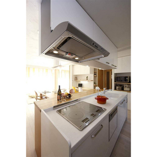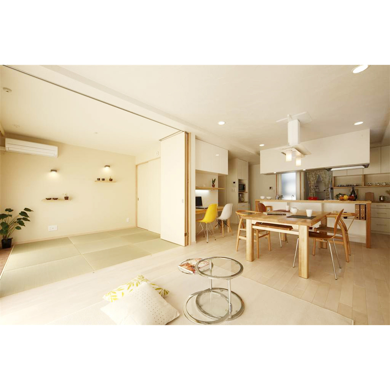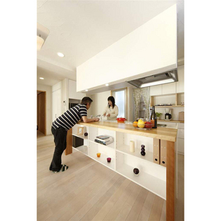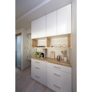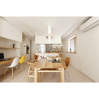 実家の2F部分を改装し、長男ご夫婦とその4人のお子様が住むため、フルスケルトンリフォームへ。お客様のご要望は、限られた空間の中、なるべく広く感じられるLDKにすること、お子様のお部屋を確保すること、そして風水を取り入れた間取りにすることでした。キッチンは、東側の朝日が入る場所とし、どちら側からも通行可能なアイランドへ。忙しい朝に、さっと朝食が取れるカウンターは樺桜の無垢板でゲート型に造作。シンプルながら迫力のある仕上がりに。背面に設けたパントリースペースは、オープンなキッチンが雑多にならないようにと配慮。奥さまの一番嬉しい場所になりました。また、ご主人のこだわりは、換気扇付きペンダント照明。愛煙家のご主人が、周りに気兼ね無く寛げるように選んだものです。家族それぞれがお気に入りのイスに座って囲むアイランドキッチンは、正に幸せを呼ぶキッチンです。