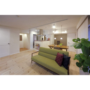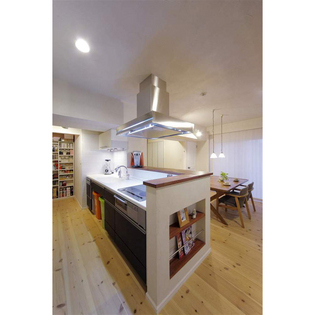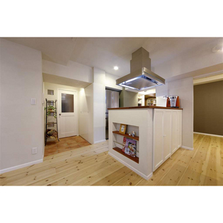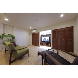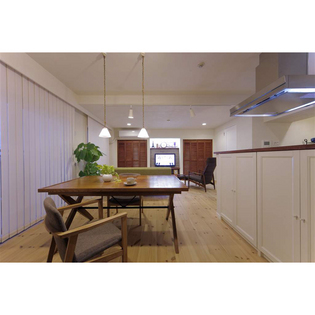 DVD鑑賞が大好きなご夫婦が、いつでもどこからでもTVを望める間取りを熱望。またお掃除ロボが不在の間に掃除できるように、収納を計画。愛犬と和める、カフェのような心地の良い空間とのことでリフォーム。キッチンの位置を大きく移動し、リビングの中央で眺望の良い窓の前に配置。料理をしながら景色とTVをいつでも楽しめる。キッチンと続きのスペースにはパントリーを設け、元々のキッチンの場所は玄関からリビングにつながるWICに。その他収納は全て造付けの壁面収納にし、収納を確保しながらも、空間は広々と見せた。キッチンの背面と、ダイニングと続く主寝室の壁の一面には、ジャパニーズカラーで塗装し、空間を引き締めた。