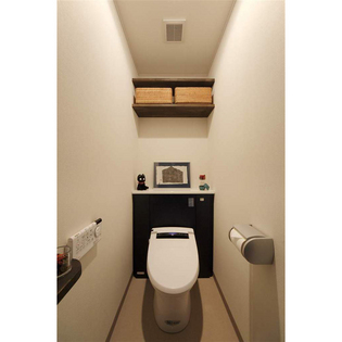 ご家族の工作作品や絵画を美しく飾れるよう部屋の壁は白く、ピクチャーレールをぐるりとまわし、対面キッチンのリビング側には飾り棚を設け、リビングをギャラリーのような空間にしました。リビングと書斎を区切る間仕切は格子をデザインした引戸。空間の中心となる引戸もギャラリーの作品のひとつです。また、普段の暮らしに美しく鮮やかな色を取り込みました。色同士がけんかしないようにベースの色を濃い茶色に統一し、色の居場所を決めて、それぞれの表情を大切にしています。