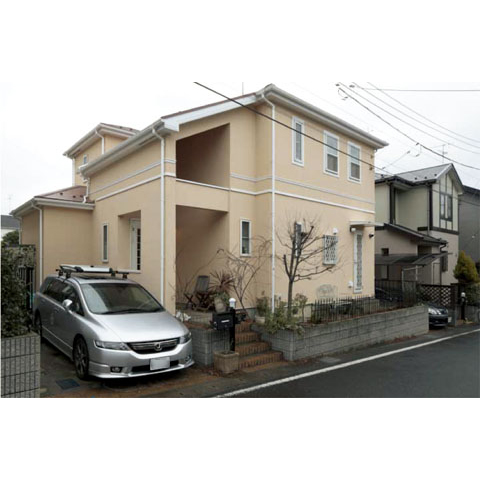 一般的な塗料で塗り替えをする場合にくらべて、わずかな費用のアップで断熱効果を得られるガイナ。見た目にも、似たような色の住宅が並ぶ中、T邸は、その明るい色がとても印象的に美しく仕上がりました。