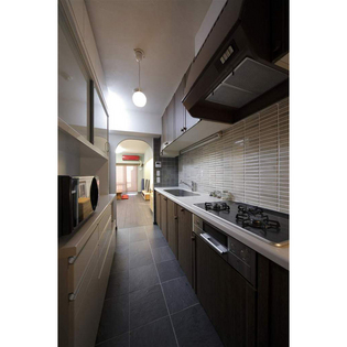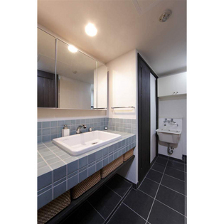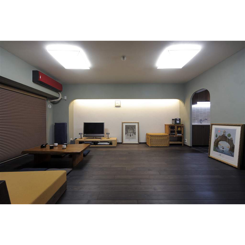中古マンション購入に伴う全内装リフォーム。今まで一般的な木目調の床に白いクロスの家に暮してきた為、逆に色を楽しめる空間に憧れがあるとのことで、積極的に色を楽しみたいというご希望でした。好みの和テイストを色彩で印象的な空間とする事に焦点をあて、なんとなく無難な方にいかないよう、見せたい箇所を見極めながら色を選択。リビング床の色は濃い炭色に決め、床は渋さに徹底した分、壁の色が映え、壁面とのコントラストを実現させた。