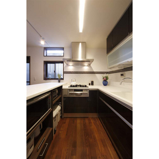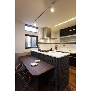 全体の内装は施主様が以前訪れたバリのモダンなホテルをイメージして、濃い木の色と壁の白の対比を強調。壁の下半分はネコちゃんを考慮してタイル貼に。照明もコントラストの強いものを用いてモダンさを引き出しています。