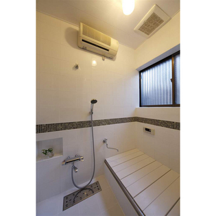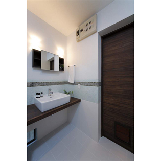 隣接する洗面・浴室もイメージを一新。こちらは思い切り明るくさわやかなホワイトをメインカラーに、ガラスモザイクタイルでアクセントをつけています。