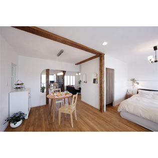 朝陽を感じて、ゆっくりと目覚める寝室は、一番あたたかな場所に。朝焼け広がる景色とおいしい食事、朝食はキッチンと寝室をつなげるセンタースポットです。全ては「穏やかなゆとり」と「甘く気ままな」生活の実現。素材のテイストは、無垢床パインにミディアムブラウン塗装。天井・壁には珪藻土。造作キッチンには色遊びを無機質感の窓廻りには内装木窓で化粧。アンティーク柱梁配置で甘くなり過ぎない調和を図った。