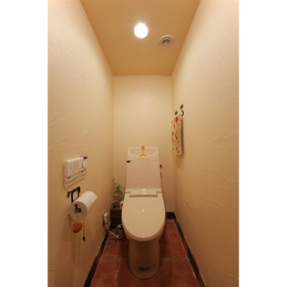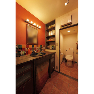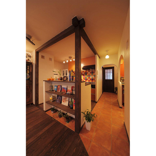 アメリカ旅行の際に訪れたセドナの雰囲気が気に入られたご夫婦は、家を作る時は「こんな感じ!」と決められており、イメージに近いサンタフェスタイルを取り入れました。自然素材で仕上げた内装は、玄関、廊下、洗面へと続くテラコッタタイルが異国の雰囲気を漂酔わせ、水廻りの壁には4色の色鮮やかなカラータイルで作ったパターンの中にメキシカンタイルを貼り見た目にも楽しい仕上げになっています。