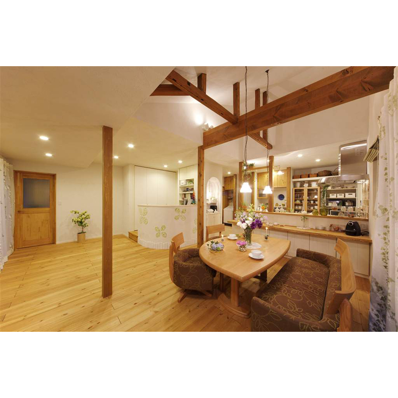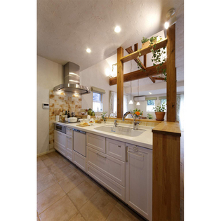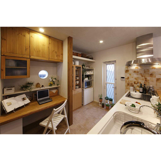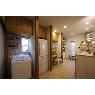 また広々としたリビングで遊ぶ子供たち、キッチンで家事をする奥様を一家の主は見守れるレイアウトに。その他キッチンをお部屋の一部のように奥さんのデスクコーナーも設置。水周りへの動線も1本で繋ぎ、子供たちをお風呂に入れながらの家事もできる。
