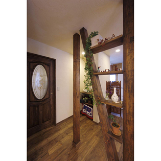 必要な耐力壁、柱を残しつつ空間の繋がりを持たせるよう、柱と筋交いをデザインとして取込み、またそこへ棚を設けることで実用性も持たせた。