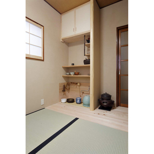 既存の和室を茶室として造りこみ、床柱(赤松)・床框(杉)も皮付きのものを取り入れるなどこだわった。以前ミニキッチンだった場所を水屋として配置し、そこからの水廻り動線を活かした。
