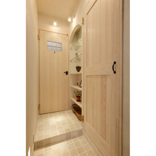 アイランドには様々な方向からの収納を造作し、壁が減った分の収納量を確保。小さいスペースながら一番のポイントは段差解消の為のリビング入口の回廊。建具位置を移動させ段数を増やす事で1段分の高さを軽減させ、ニッチのギャラリーを楽しみながら隠れ家Caféへ回廊を降りていくかのような演出に。