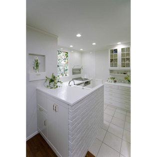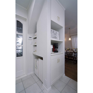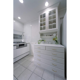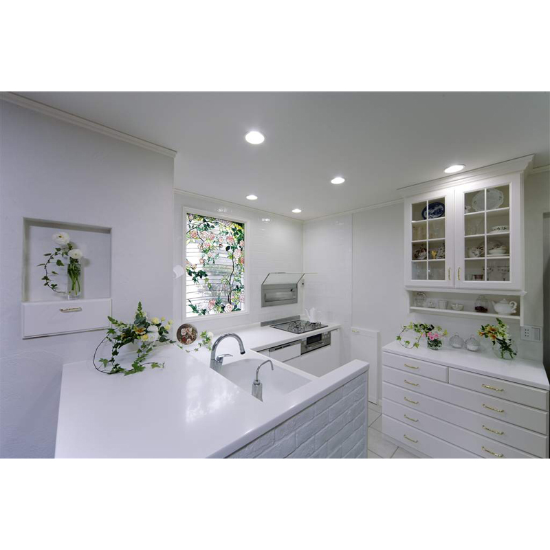 水廻り設備の老朽化からリフォームを決意。今までのキッチンを一新するような空間にしたいことと、光の入らない暗いキッチンに光を取り入れたい。キッチンに立っても家族とコミュニケーションが図れる対面式にし、白く清潔感溢れるキッチンにしたいとのご希望でした。階段下収納の変形な空間を利用し、オブジェのような収納を造作どこに何を入れるかの収納計画をお客様とお話をさせていただき確定。いつも綺麗なキッチンが完成した。また、キッチンは奥様のお城、大好きな薔薇の花をステンドにし、いつも眺められる位置に取り付けたいとのご要望があり、バラのステンドグラスを光が差し込む場所に設置。お料理の時間を楽しく過ごせる場所に。