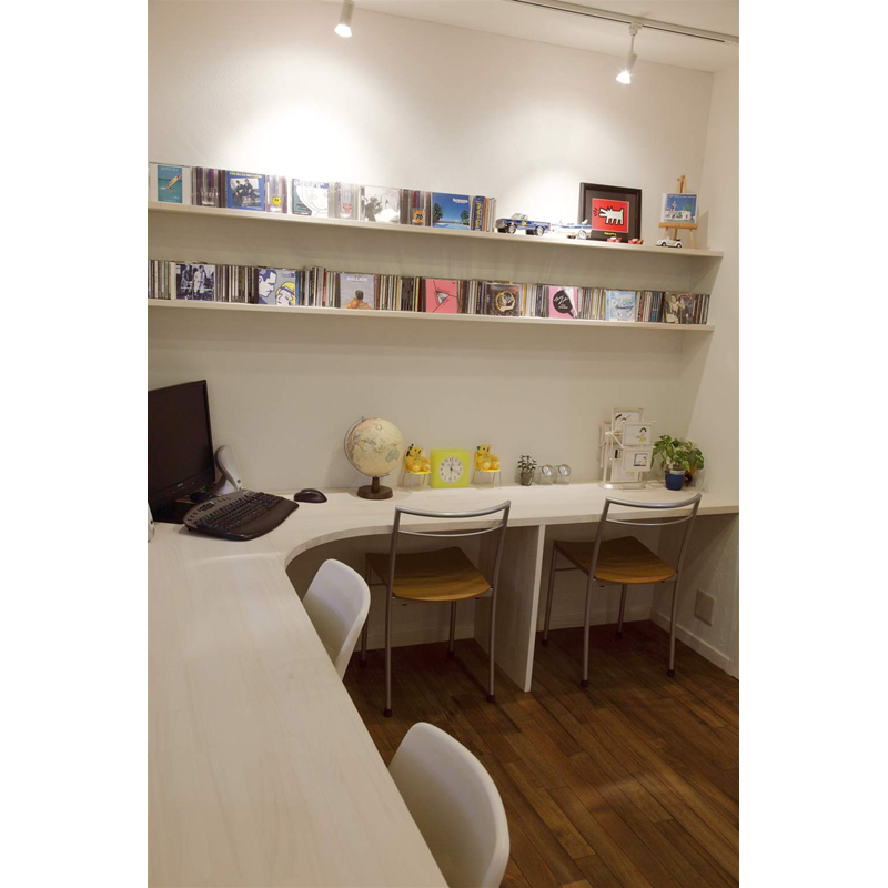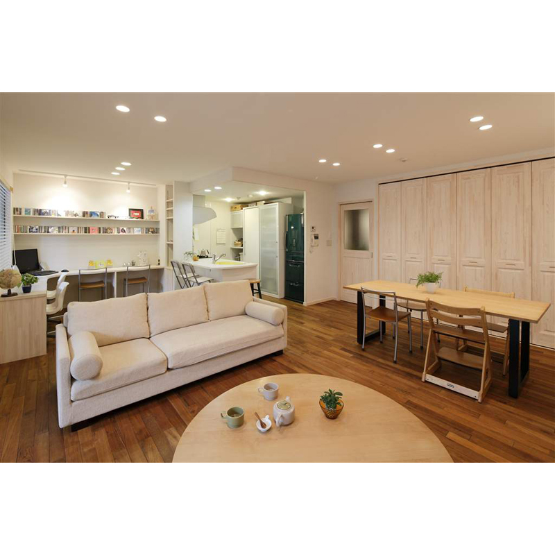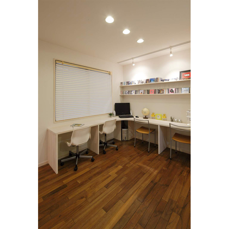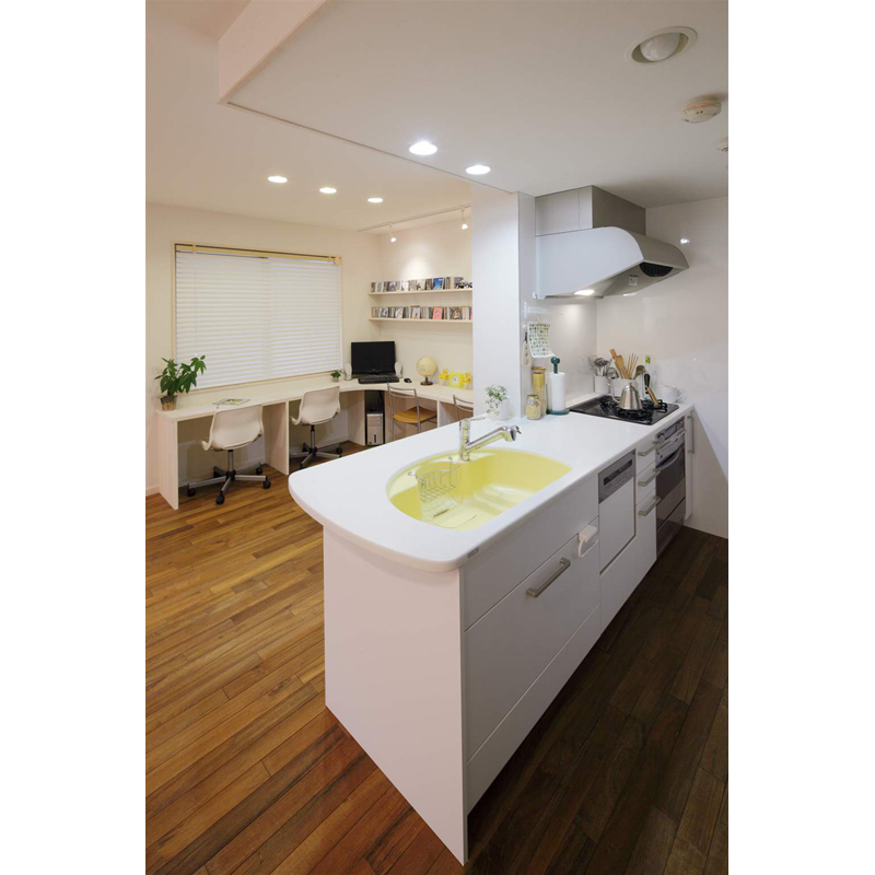 奥様は看護士のお仕事をされており、忙しい日々。その忙しい合間にこなす家事を少しでも楽しく、お子様達とのコミュニケーションのとりやすいよう、オープンなキッチンに。ご主人の書斎を兼ねたワークスペースはお子様達の勉強机としても利用することが出来、育ち盛りのお子様たちとのコミュニケーションを大切に思う気持ちが形になりました。