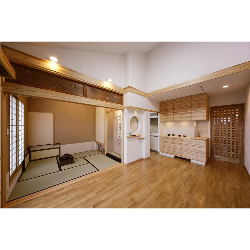奥様の趣味でもある、茶道が住まいの中でも気軽に練習やお友達を招いてのお茶会ができるよう、機能性とデザイン性が融合した空間をご希望。窓辺部分は、すべてインナーサッシを配し、空間に合わせた結露対策と、珪藻土や無垢材などの調湿素材をご提案。また、フレキシブルで内部パーツを交換すればよい収納を奥行きの変化を付け、使用頻度の高いところへ配置。茶室は県産材の西川材を採用、モダンで本格的な茶室へ。リ