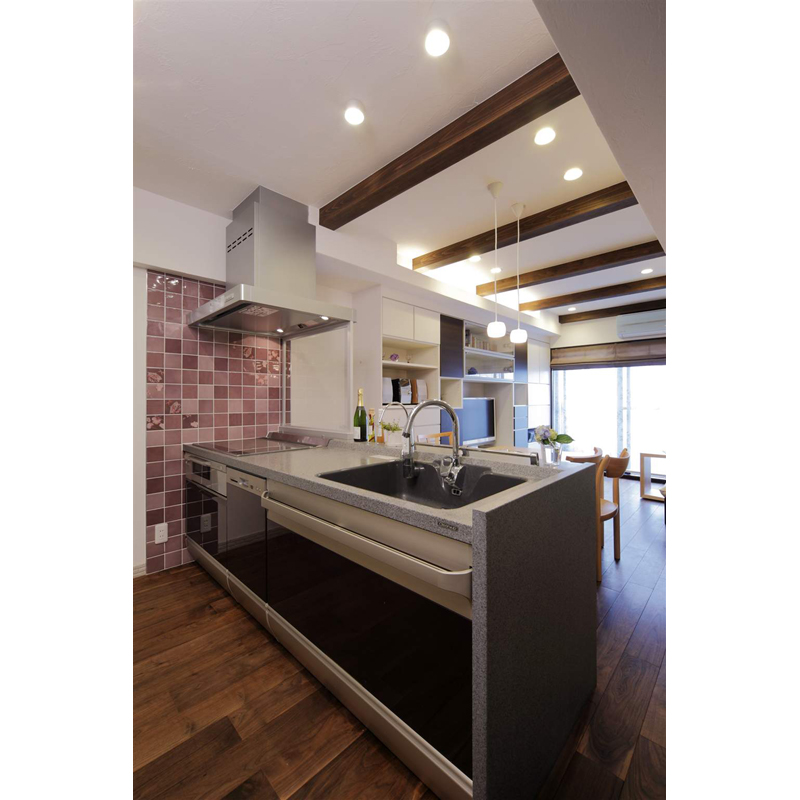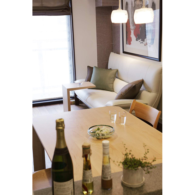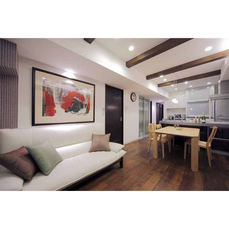 2匹のペットと好きな無垢材を沢山取り入れた空間で、快適に過ごしたいというNさん。そこで今までリビングに隣接していた和室との間仕切壁をずらし、リビングにゆとりを出し、床には無垢のウォールナット材、天井・壁には漆喰を採用し、ペットの匂い等を解消する快適な空間を実現。