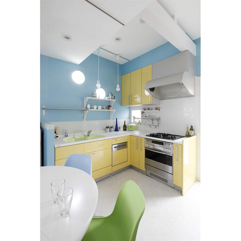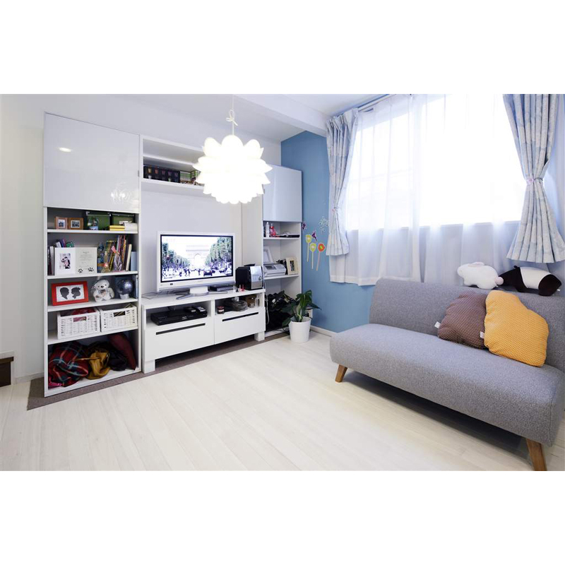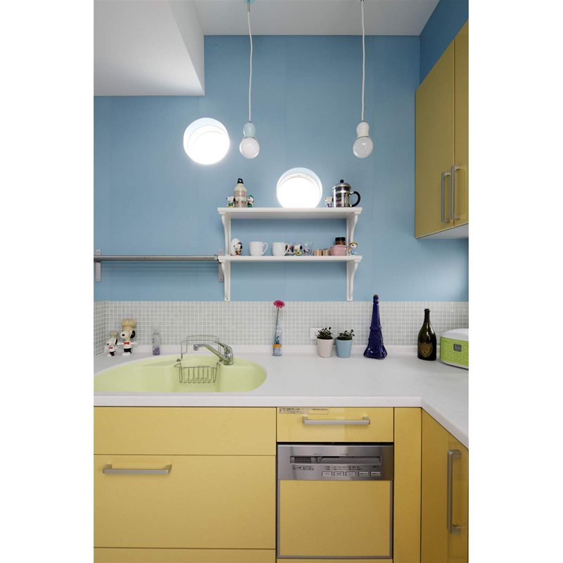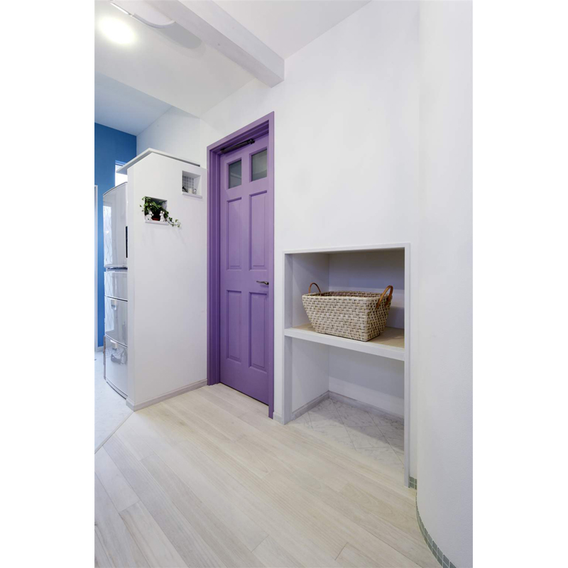 リフォームをするにあたり42m2と限られた空間の中にLDKと主寝室、水廻り(浴室・洗面室・トイレ)を配置する為、廊下はつくらず、LDKを中心に各お部屋へ出入できるような間取りに変更。至る所にお好みの雑貨や写真等をディスプレイできるよう、カラーの中にデコレーション(飾りつけ)を楽しむ場所を隠しました。