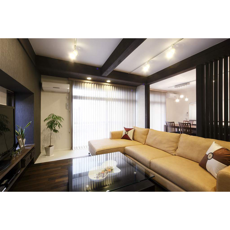 リゾートのような空間をイメージした開放的なリビングは、既存の梁の位置に合せて、壁の中に隠れていた柱を表に出し、格子や天井の羽目板をプラスして意匠的に木部を引き立たせています。