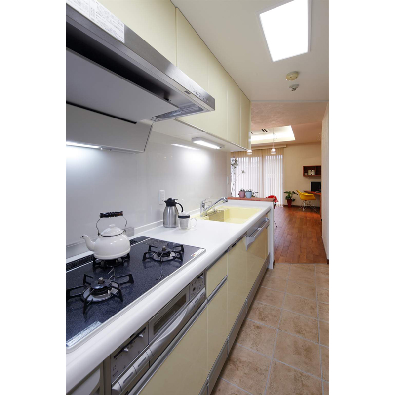 そこで、玄関からリビング、リビングからプライベートルームへとスムーズに通れるように廊下をなくしました。広いリビングには、小上がりをつけた茶室のような和室にサンルーム。デザインのポイントは潔い直線とビタミンカラー。
