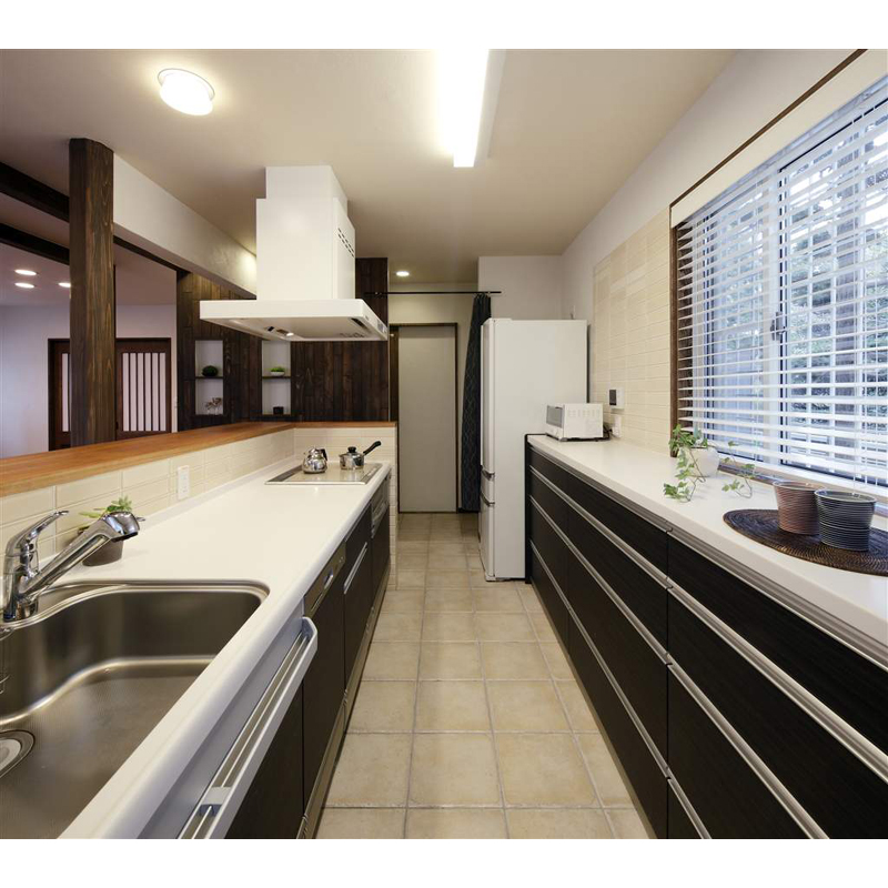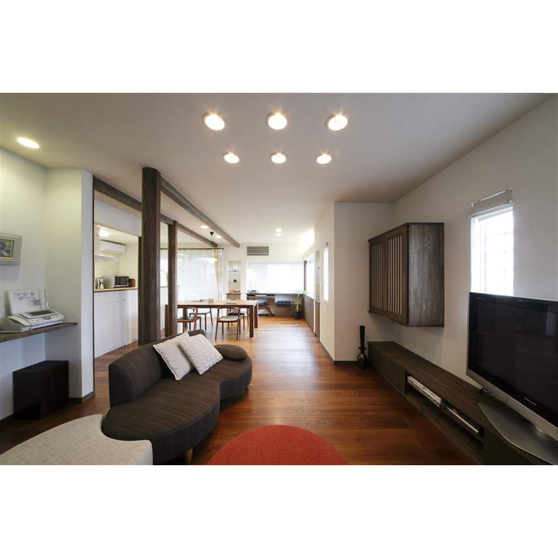そこで、独立型のキッチン、段差のあるダイニングとリビング、納戸代わりになってしまっている和室…と、以前のお住まいは、空間は広いのにその中の1角しか使われていなかった為、段差をなくしLDKを1つの空間とし、明るさ・開放感・一体感を感じられる間取りに変更。コミュニケーションがとりやすい空間作りを考慮しました。