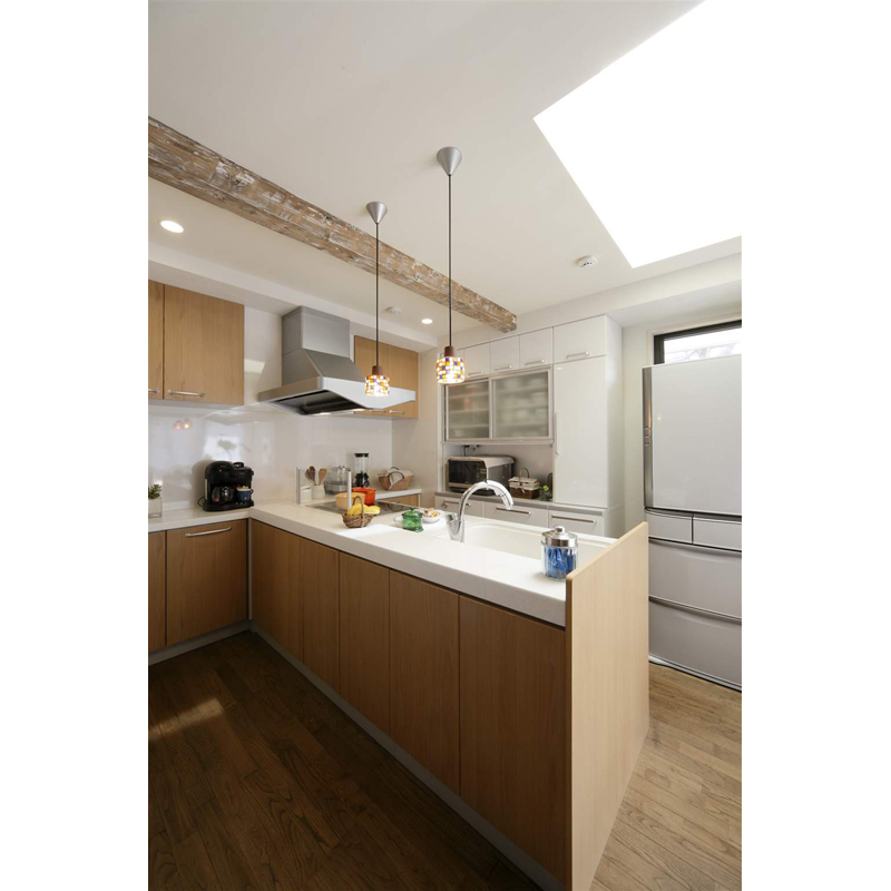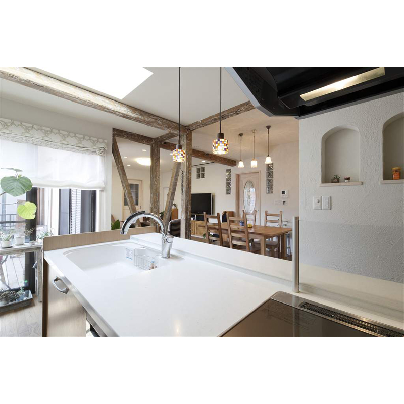 そこで、2階に比べて暗くなりがちな1階には、南側のキッチンに天窓を取り付けることにより、採光の時間を長く感じられるように工夫。LDへのつながりを常に感じられるよう、構造や付け梁などの木部をアクセントデザインに。