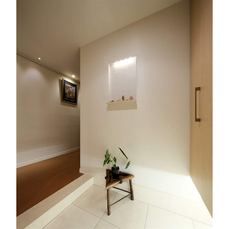 平坦に見える、壁や天井を彩る照明は、画一的にならないように、リズムを持って取り付けています。