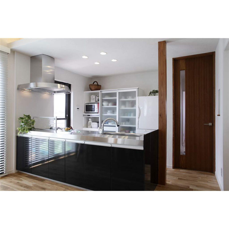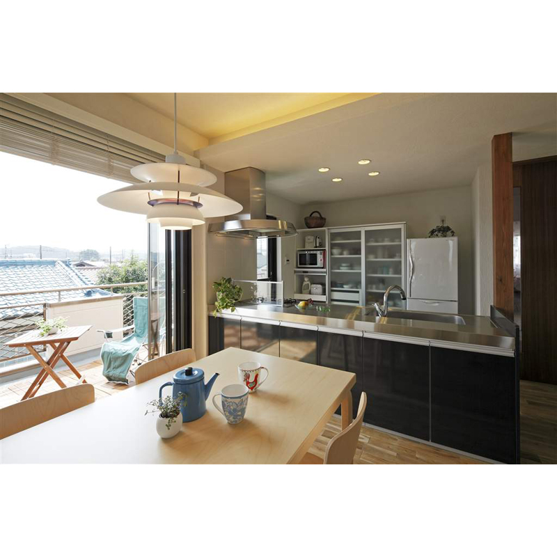 そこで、LDKのどこにいても外の景色をLDKに取り込めるように、コーナー出窓はリビングに計画。キッチンは開放感のある対面式にし、コーナーの抜けない柱はデザインの一部に取り込み、生活動線を妨げないように配慮しました。リビングとの繋がりも視線を妨げないよう、壁は作らずコボット(ワイヤー式筋交)を取り付け。