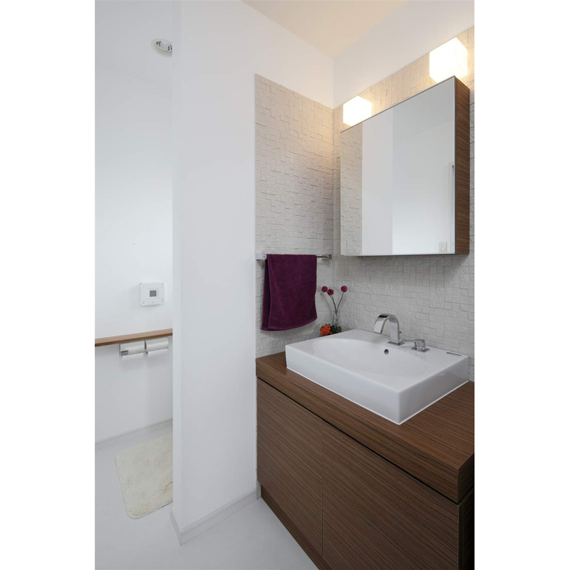 洗面脱衣室・トイレも開放感を重視し、扉は取り付けずUBの扉と小窓もクリアのガラスを選択しました。
