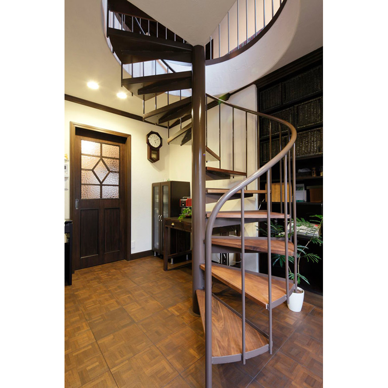 狭かった1Kの母屋と上階をケコミのない螺旋階段でつなげることで、空間を有効利用できる開放的なスペースに。さらに2F部分の天井の高さを屋根なりの形状にして高さを出してデザインを施し、視点によって面白い眺めを得られる素敵な空間が生まれました。