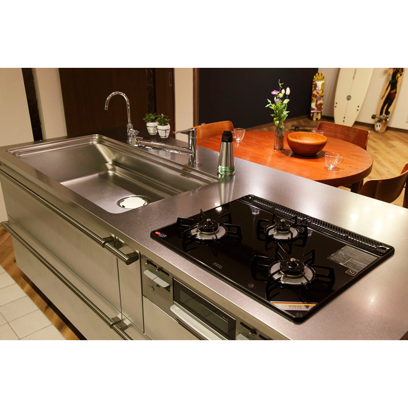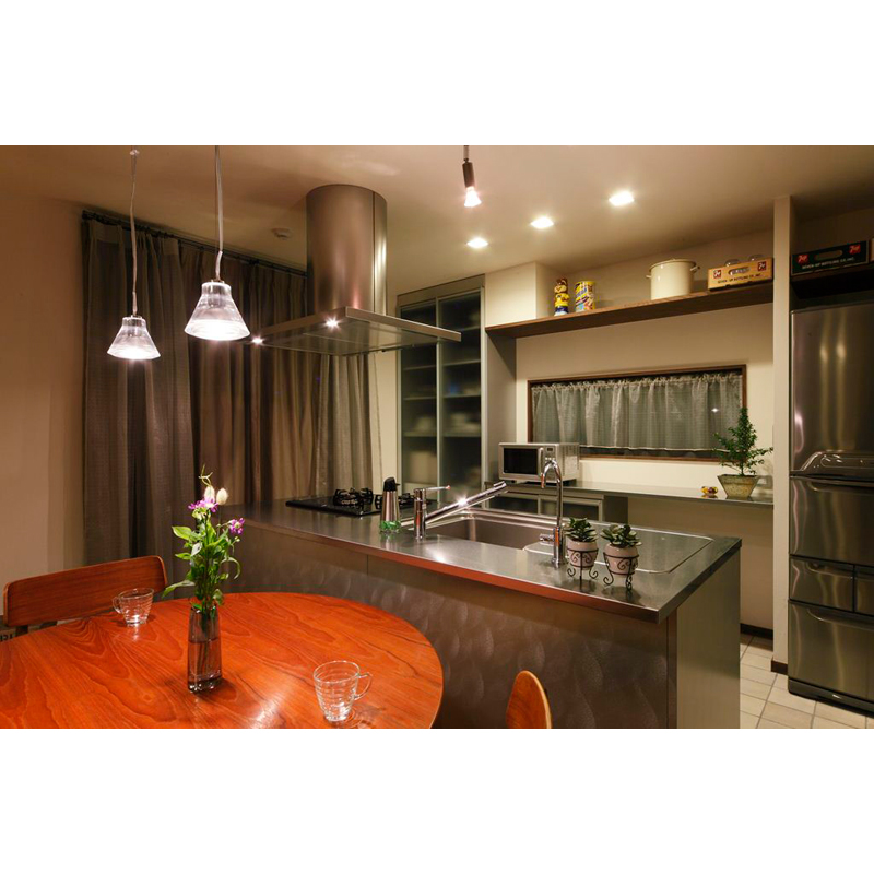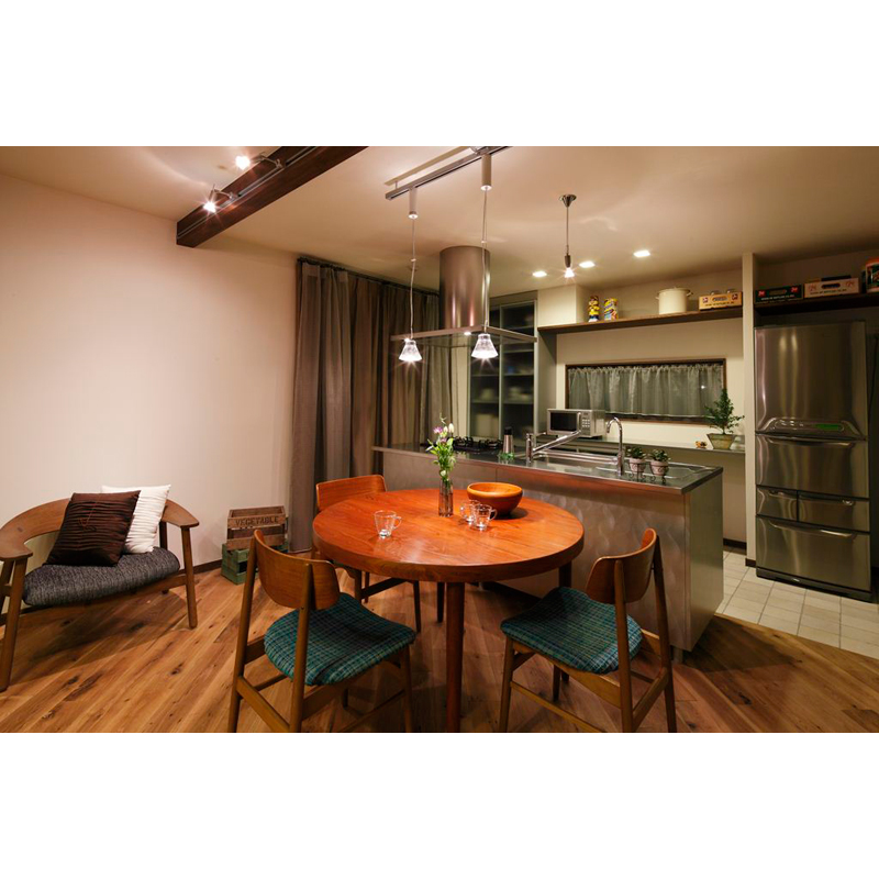 浴室・洗面室・トイレは築年数も浅いため将来的に…との事でしたので、先々も視野に入れた間取りをご提案。今回は斜めのラインの壁を効果的に活用し、和室の押入もLDK空間に取り込みました。ポイントはご主人こだわりのステンレスキッチンです。