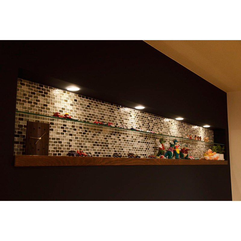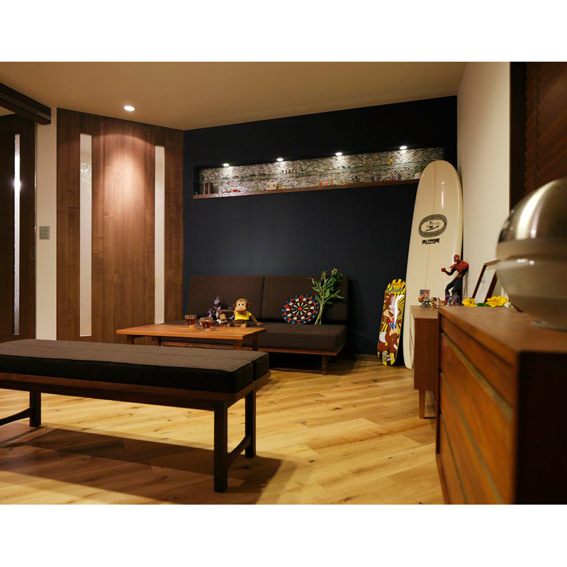 『無機質の中にも木の温もりも感じられる、大人の秘密基地』をコンセプトとし、味わい深さが増すような素材・色合いでコーディネート。ポイントになる斜めのラインの壁はダークな色・無機質な素材(ガラス)・木を使う事で空間をひきしめ、落ち着き感を出しました。