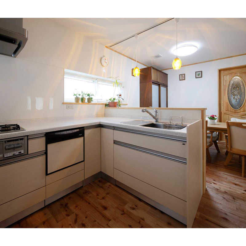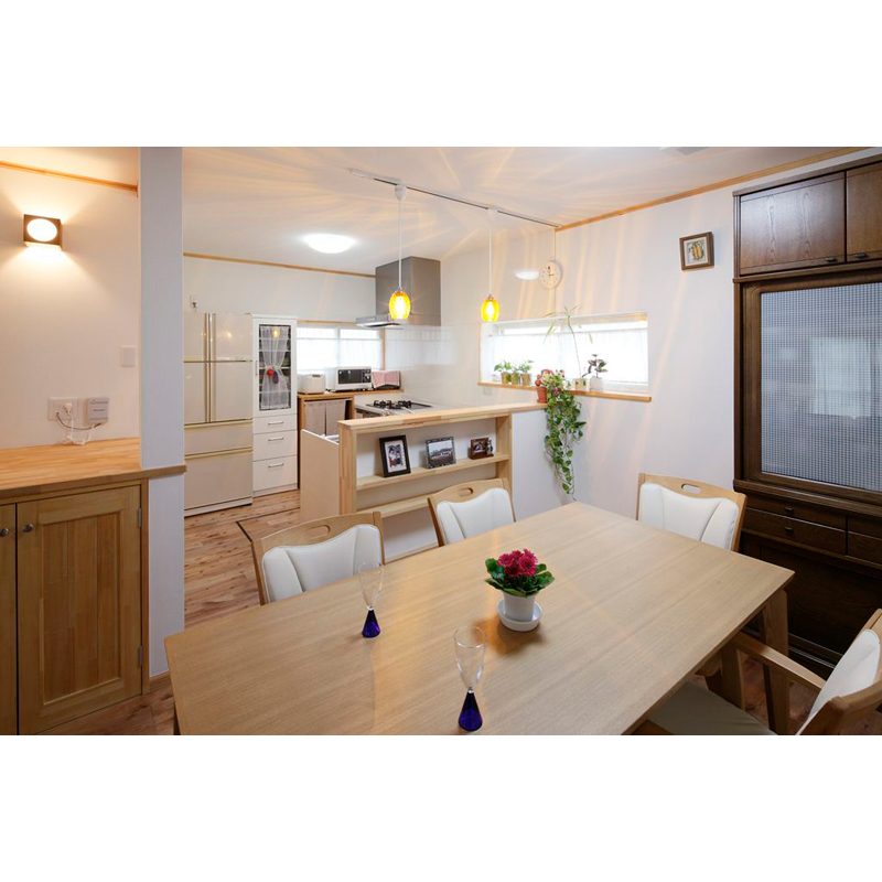 二世帯が集まるLDKは、奥様希望の対面キッチンに。奥様のお母様やお嬢様と一緒にお料理が楽しめます。また、浴室や洗面所を増築部分にまとめたことで、広いLDKを実現。抜けない柱は、収納スペースや飾り梁を付けてLDKのポイントに。全部の窓にインナーサッシを付け、省エネ対策も充実しました。