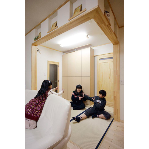 この畳スペースは、お雛様を飾ったり、物干しスペースに使用したり、本棚を置き書斎として使用できるように。洗面所の隣なので、洗濯物を干すのが楽になりました。壁や棚には家族の写真や小物が飾れるスペースをたくさん設け、間接照明も楽しめます。