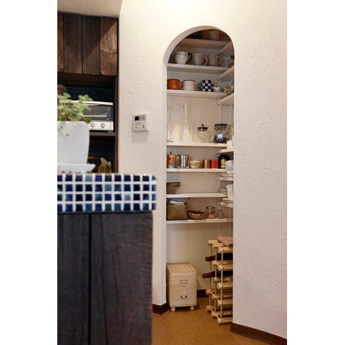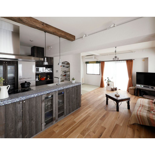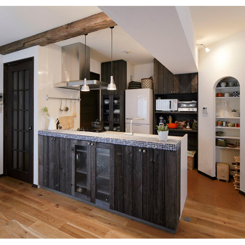 「お休みの日に窓の外を眺めながら、ひなたぼっこするのが気持ちがいい」「外を眺めながらキッチンに立てたらいいね」というお話をうかがい、キッチンの向きを大胆に変えて完全なオープンスタイルに。キッチン前面と、後ろの食器棚・家電収納は、本物の古材をつなぎ合わせた扉で造作。ずっと眺めていたくなるような、味わい深いキッチンになりました。