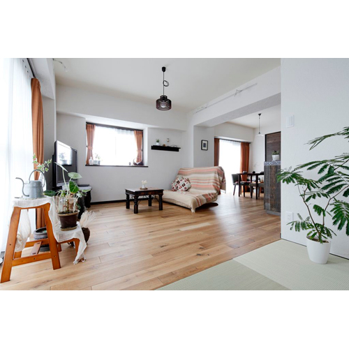 使いこんだ木の風合いに心が癒されるという施主様に、フローリング・建具なども味のある落ち着いた合わせをご提案。天井には本物の古材梁を。「LDKが広くなるのはいいけど収納は減らしたくない」という問題も、トイレの位置を動かすことで解決できました。