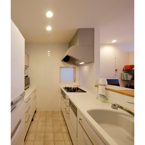 キッチンはお部屋の間にあった壁を撤去し、ひとつながりの空間に。奥様の好きなオレンジ色を随所にデザインし、楽しく家事が出来るようにしています。対面カウンター収納とパソコンデスクをL型につなげ、背を低くすることで圧迫感も軽減。奥様のアイロンかけスペースにも活用できます。
