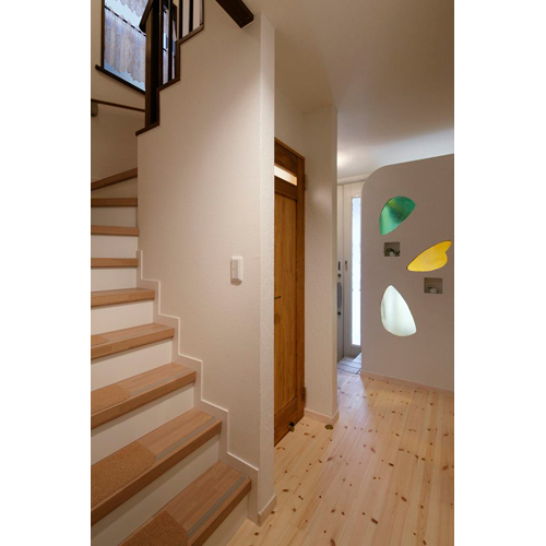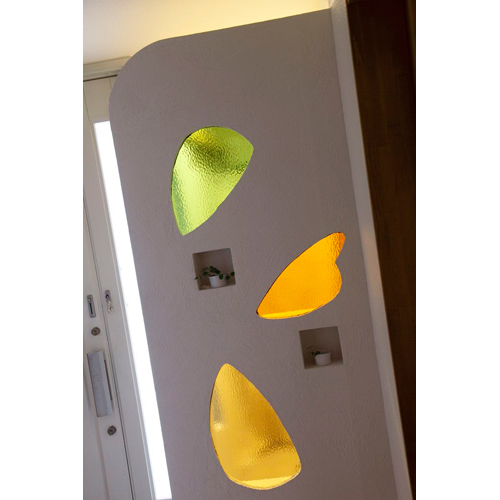 「帰ってきたとき、ほっとできて楽しめる玄関に」。オレンジとグリーンの色ガラスでデザインした玄関は、ビタミンカラーの光が満ち溢れる素敵な場所になりました。