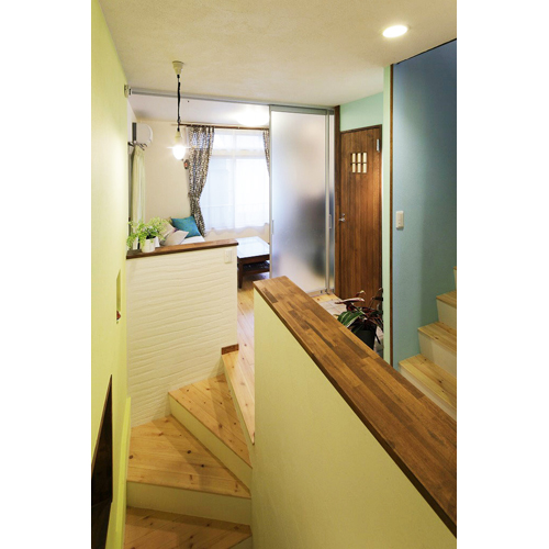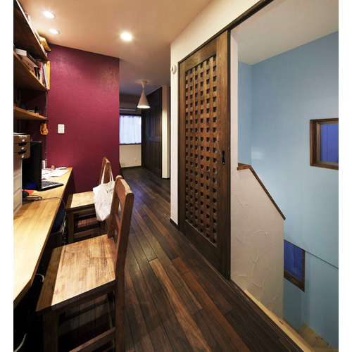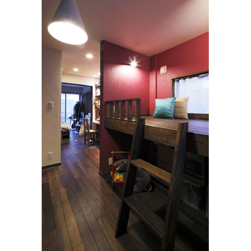 1Fと2Fは奥様のご希望により、爽やかな明るいカラーの壁とパイン材の床でかわいく楽しい空間に。3Fの寝室はご主人のご希望で、落ち着いたレッドの壁とウォールナットの床材を使用。何層も重なったケーキのような色彩とともに、質感の違いも楽しめるようになっています。