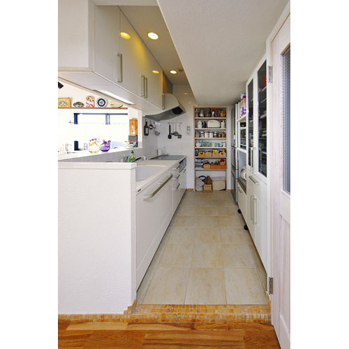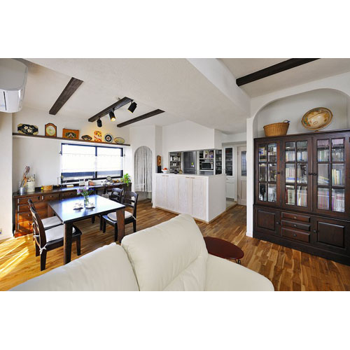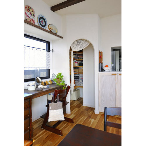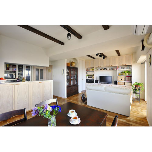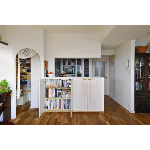 そこで、キッチンは壁を取り去り対面式に。柱や梁型の位置を利用した細かい収納を各所に設けることで、コンパクトかつスッキリとしたスペースを実現しました。