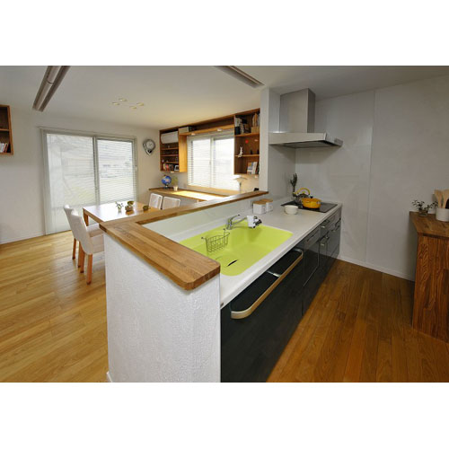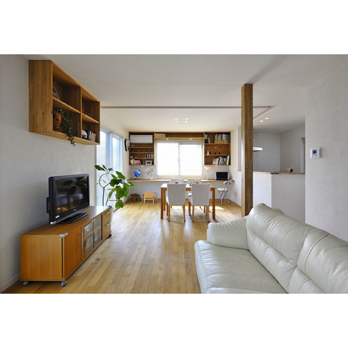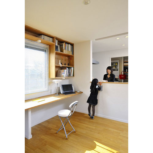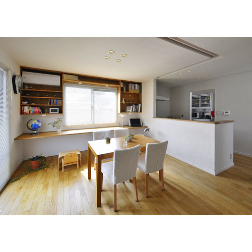 親の目の届くところで安心して本を読んだり、お絵かきをする子は頭が良くなるというデータがあります。そこで、リビングで家族とたくさん過ごせるように、勉強スペースを設け、壁にはたくさんの本棚を設えました。