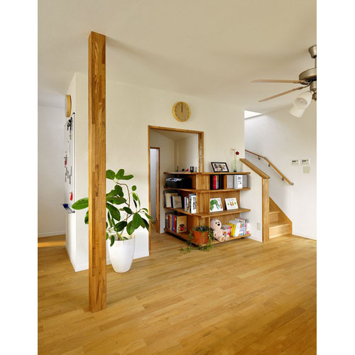 パパの本・ママの本・わたしの本や作品・アルバム・おもちゃ・・そして階段の下には地層をイメージした本棚と、あなぐらのような小さな図書館をつくりました。