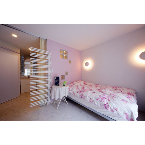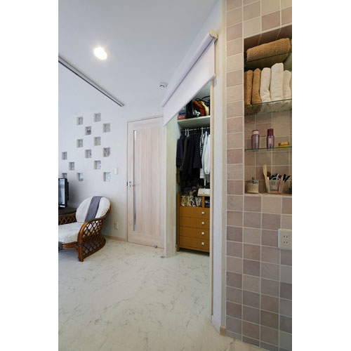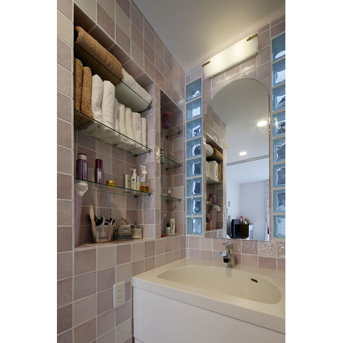 K様の想いは、藤色のようなピンク、優しいグリーン、ガラスブロック、ニッチなどの造作に表れています。憧れていたものに囲まれて、過ごす日々。想いがようやく形になった喜びに溢れています。