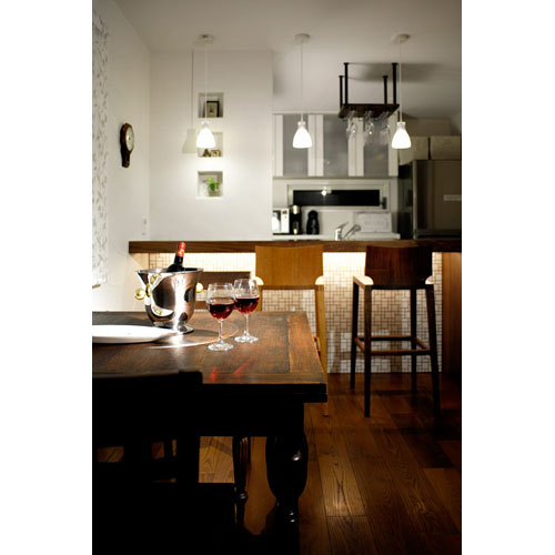 「雰囲気のあるおしゃれなバーのようなキッチンカウンターを」というご希望から、キッチンを対面式に移動させてキッチンカウンターとワイングラスホルダーを同素材で造作。