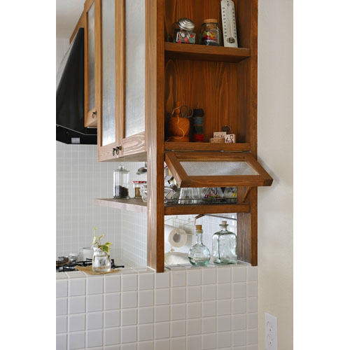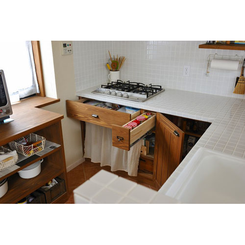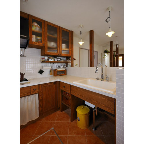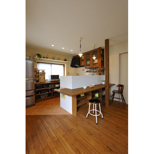 キッチン部分は収納、カウンターも含めすべて造作。奥様ご希望のタイル貼りの質感と、収納部分やカウンターの木の風合いが、ナチュラルなカフェの雰囲気を実現しています。