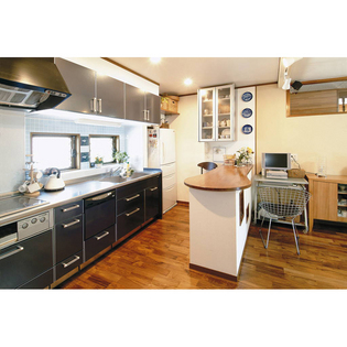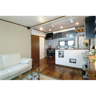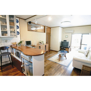 シンプルなデザインが好きな奥さまのご要望に合わせて、リビングの壁材は珪藻土、床材は無垢板のチークを使用しました。カウンターテーブルは変形の造作家具を用いてオリジナリティーを出しています。