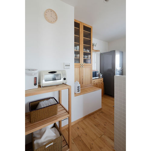 東、南北に窓があり、更に西側につながる主寝室との間仕切り壁に、2枚引き込みで大開口できる内窓を造作。4面から光と風が入る、明るくて気持ちの良いオープンキッチンになりました。