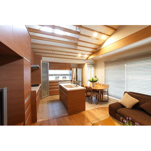 そこで、突板張りで重い印象の天井と個性的な三角形の高窓を明るくスッキリとしたデザインに一新。リブを等間隔に天井につけることで、天窓からの彩光がグラデーションのようにお部屋に差し込むように工夫されています。