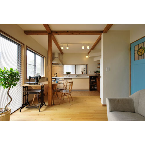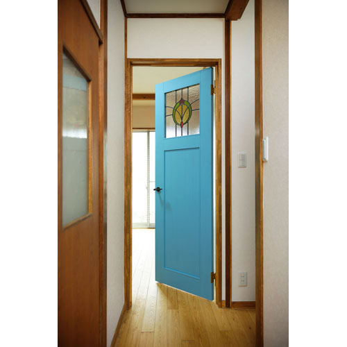 そのままの高さで窓枠や窓台だけを変えた和室窓など、カントリー風なインテリアの中にも木造在来の建物の雰囲気が感じられる、趣のある内装に。奥様こだわりのアンティークガラスをはめ込んだブルーの扉は、LDKはもちろん、お家全体が華やぐアクセントカラーになっています。