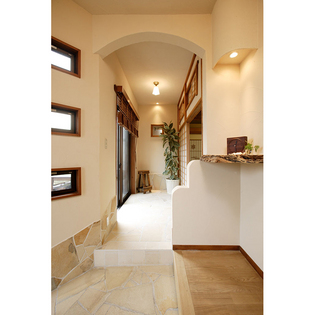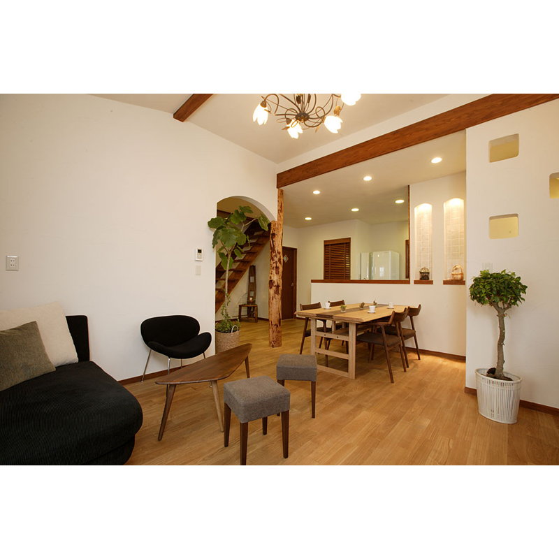LOHAS studioのように自然素材を使ったプロバンス風の住まいが希望とのことリビングやキッチンを一体化して広々使いたい。1階と2階の間の未使用空間の有効活用も希望されてました。