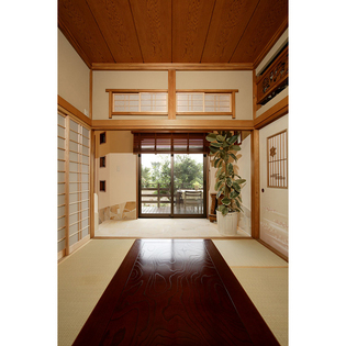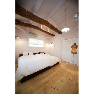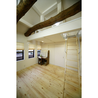 仕切壁を取り除いて大きなLDKにしました。また未使用空間を利用して1階の天井高を3mにし広々とした空間に仕上げました。2階も天井を上げて既存の丸太の梁を見えるようにしロフトを設置しました。床には無垢材、壁には珪藻土や木絹和紙など厳選された自然素材を使用。増築をせず空間的な広がりを生み出しました。