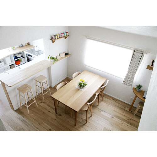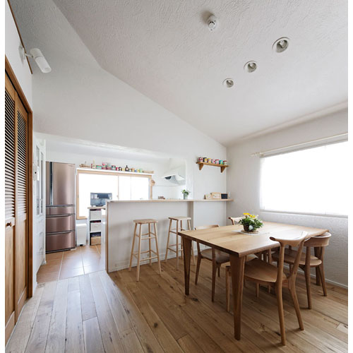 また、ふところの合った天井裏を解体し、勾配天井とする事で、開口高が上がり、閉鎖的な空間に広がりが生まれました。